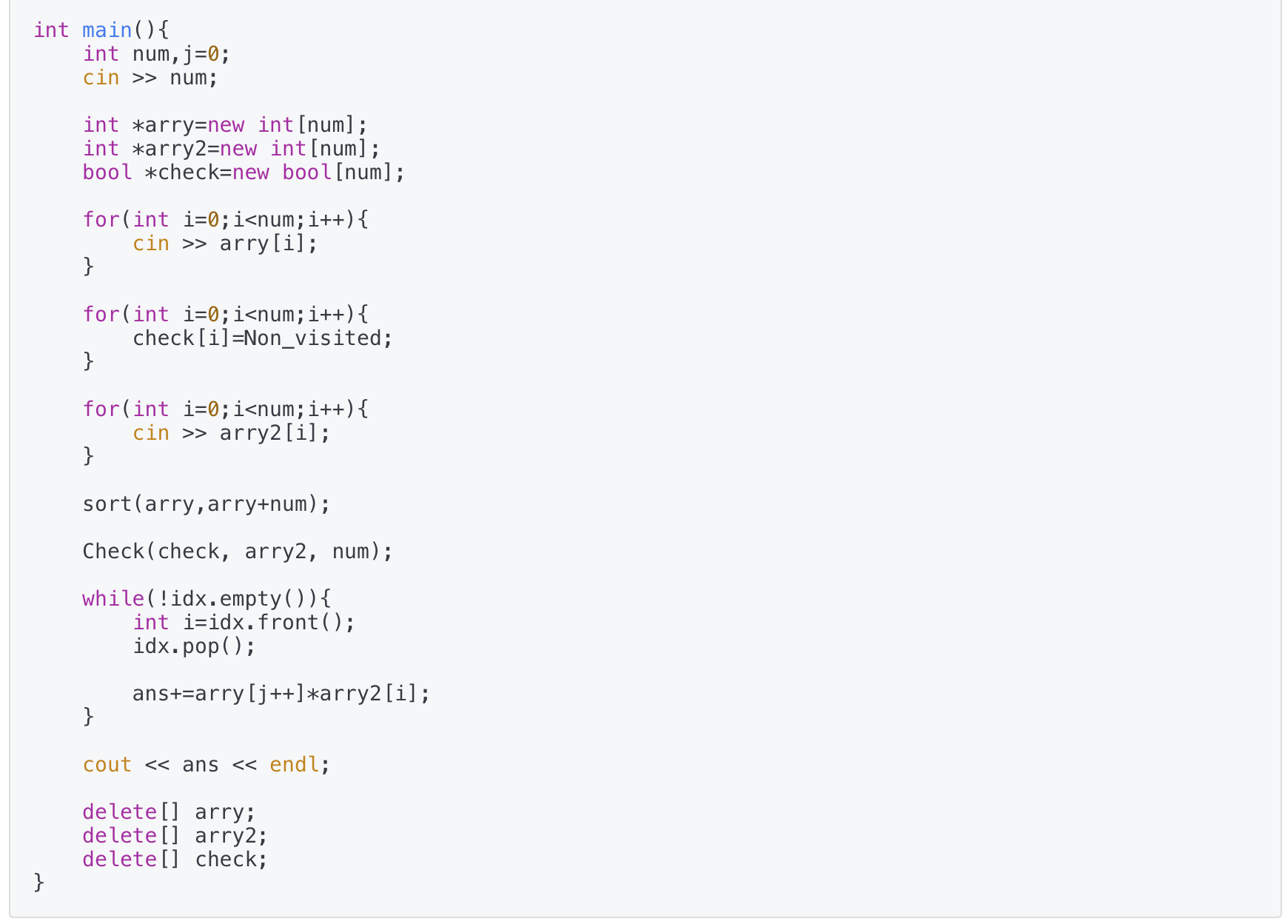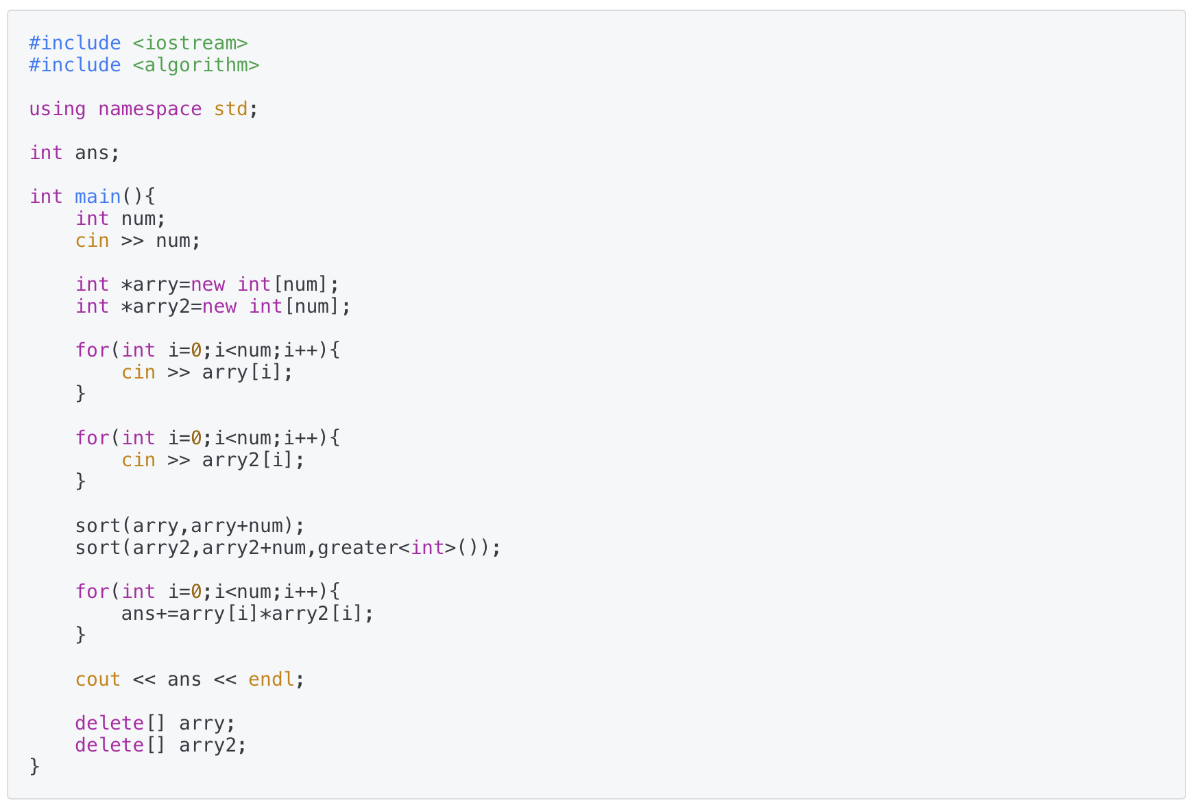 sort함수를 사용하여 A와 B를 정렬시키고 곱하면 된다. 문제에서는 B를 재배열하지않고 풀어야해서 B의 최댓값의 인덱스를 구해서 큰 순서대로 큐에 저장하고 A를 정렬시킨 뒤 둘을 곱하였지만 틀렸다고 나와서 기존 코드를 첨부한다(해결).