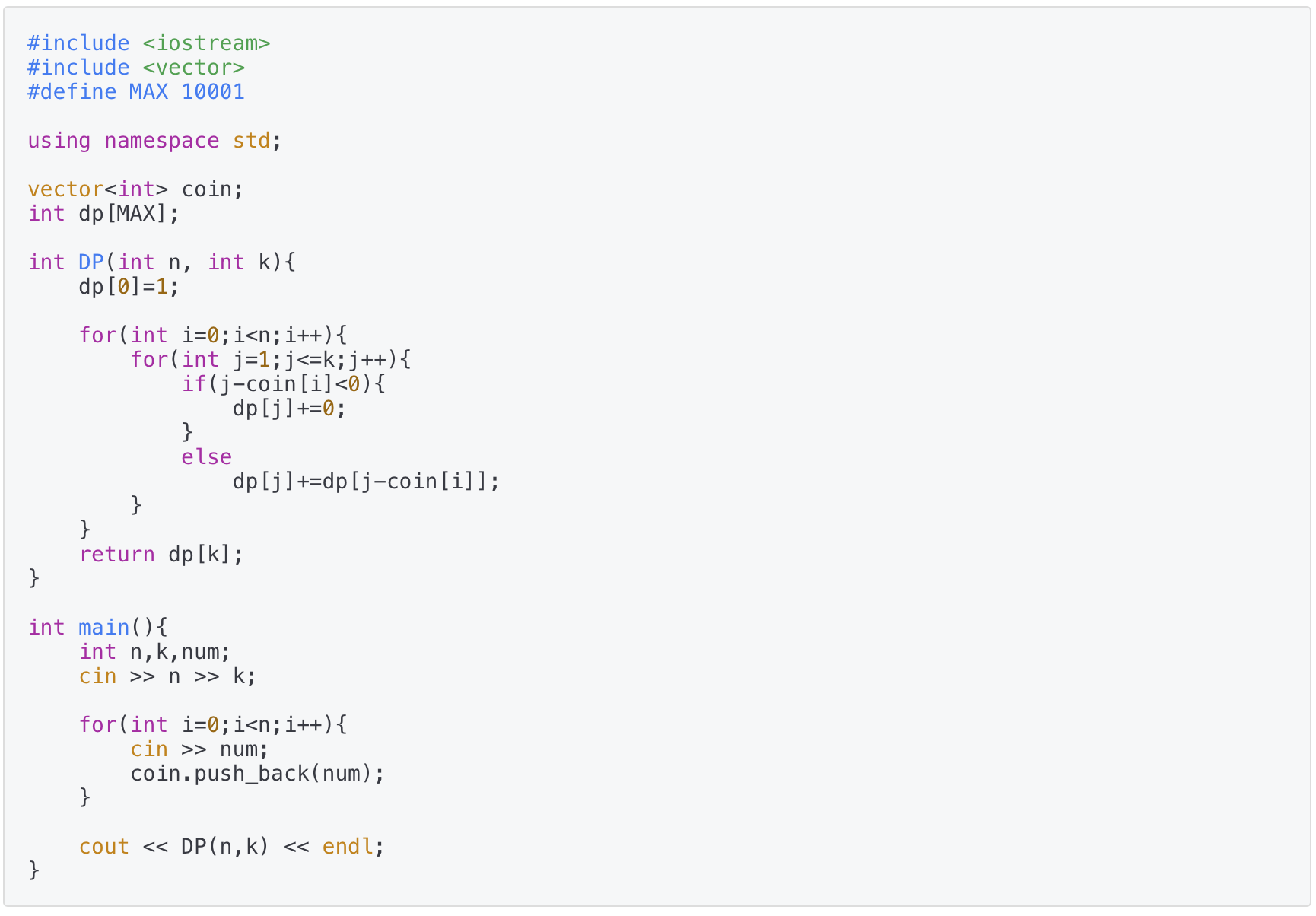 이를 토대로 점화식을 세우면 dp[k]+=dp[k-동전] 이고 이 식을 이용해 문제를 풀면 된다.