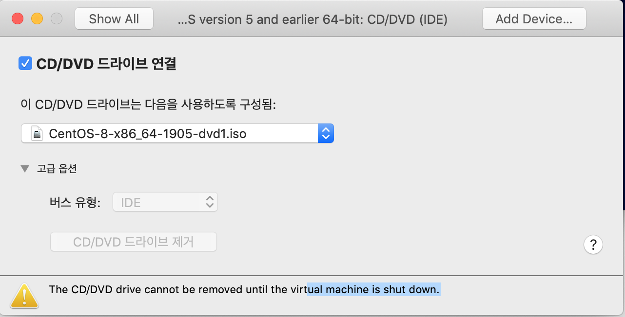 6. 이 상태에서 Setting에 들어가 CD/DVD로 들어간 뒤 Centos8 이미지로 넣어주면 해결 완료.