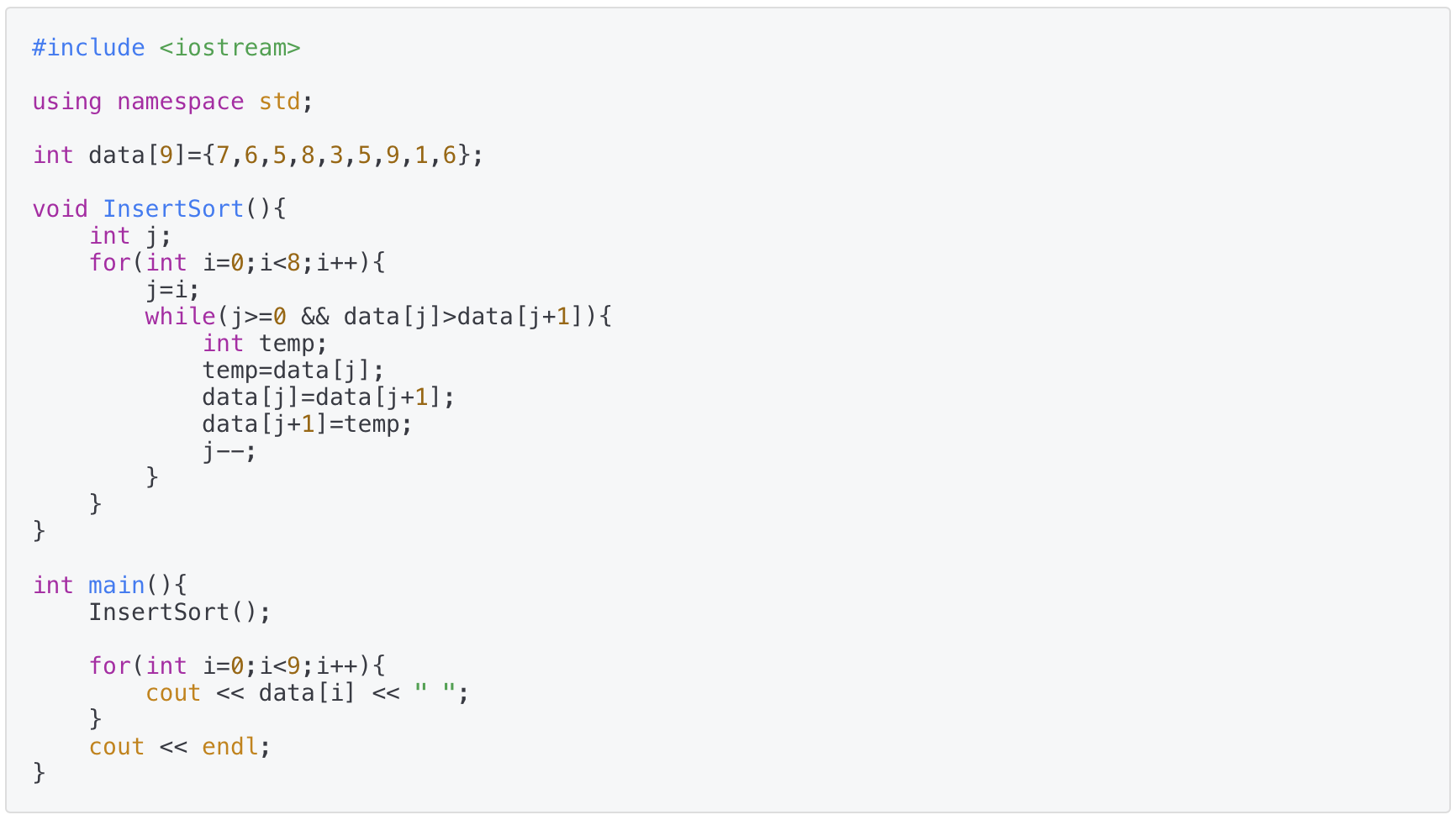앞에서부터 시작하여 범위를 늘려가며 자기 자신의 자리를 찾는 정렬 방식이다.