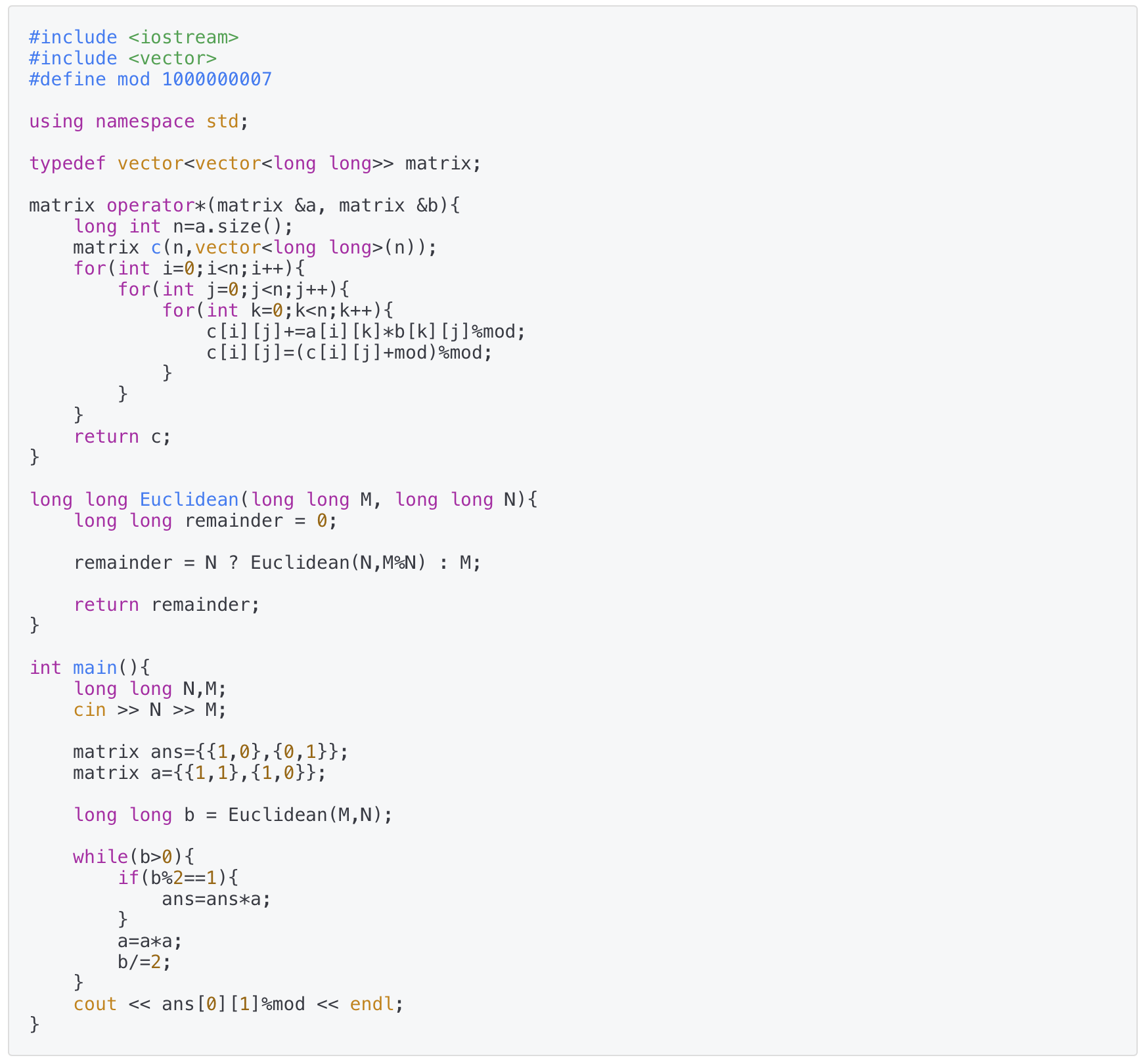 찾아보니 다들 피보나치 성질 중 G{fibo(N),fibo(M)} = fibo{G(N,M)} 이 성질을 이용해서 먼저 최대공약수를 구하고 피보나치 수를 구했다.