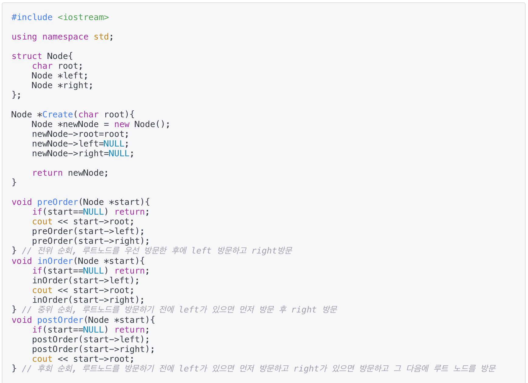 전위 순회 : 루트 노드 방문하고 왼쪽 자식이 있으면 왼쪽으로 쭉 방문하고 그 후 오른쪽 자식 방문(만약 왼쪽 자식이 있어서 그쪽으로 내려가
