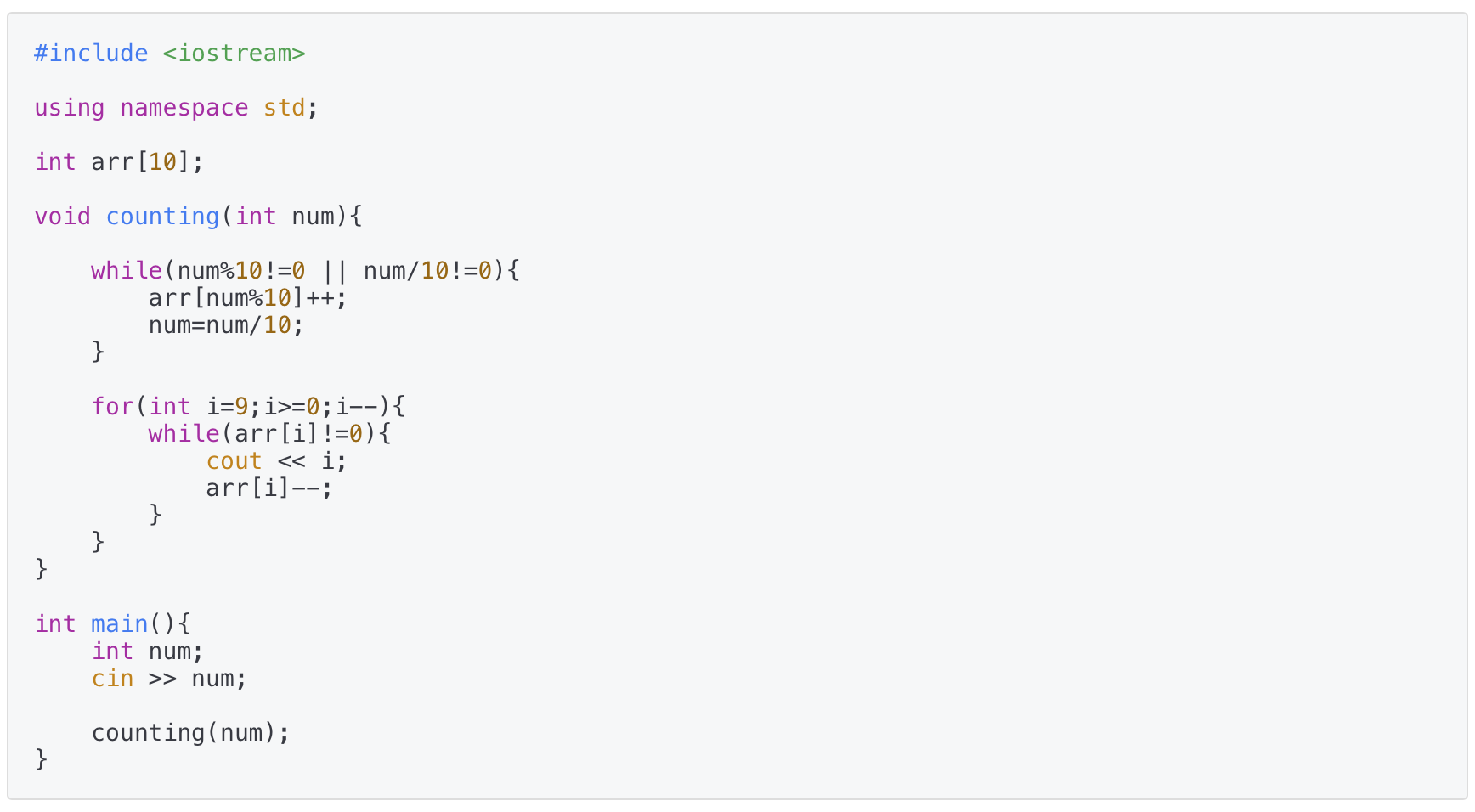 숫자로 받아서 각 자리수를 나눈 뒤 카운팅 소트 사용.