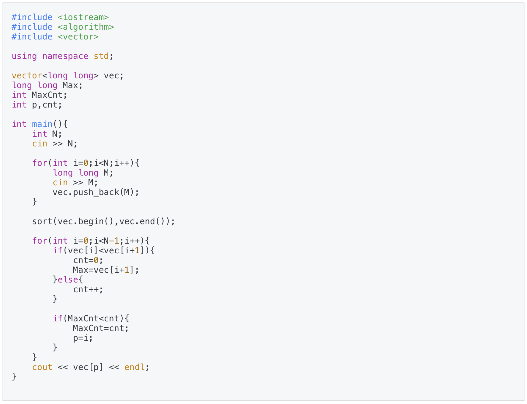 앞에서부터 개수세고 개수가 많으면 그때의 인덱스와 개수를 저장하면 된다.