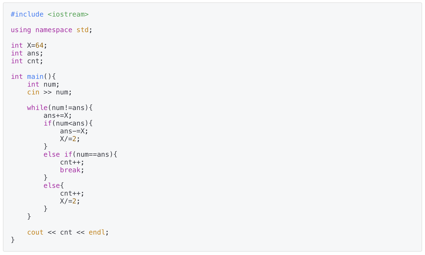 X값 64를 2로 계속 나누어 32, 16, 8, 4, 2, 1를 구하고 정답까지 더하면서 카운트해주면 된다.